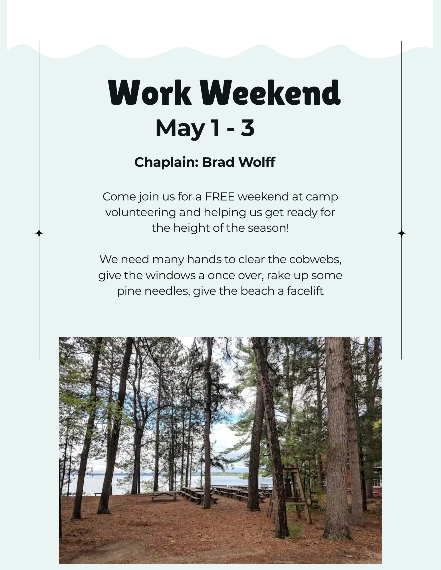 *Work Weekend May 1–3 – *Free for volunteers who come to lend a hand!